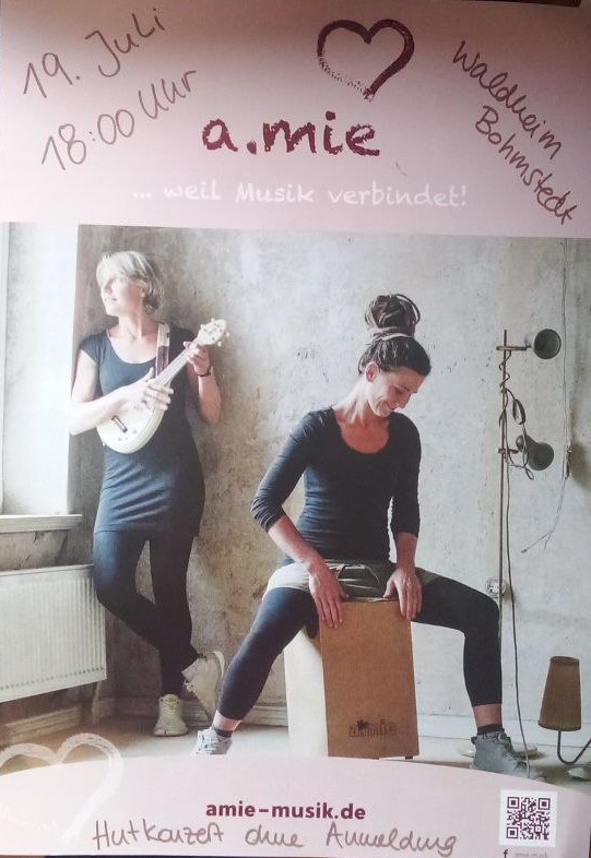 Konzert mit a.mie am 19.7. um 18:00 Uhr "...wir kommen musikalisch vorbei, immer scharf bewaffnet mit Klavier, Ukulele, Gitarre, Cajón und zwei lieblichen Stimmen. Mit einem Faible für französische Chansons, deutsche Liedermacher und englischen Pop, verfeinert durch unseren gewohnt frisch-frechen Charme!" | |